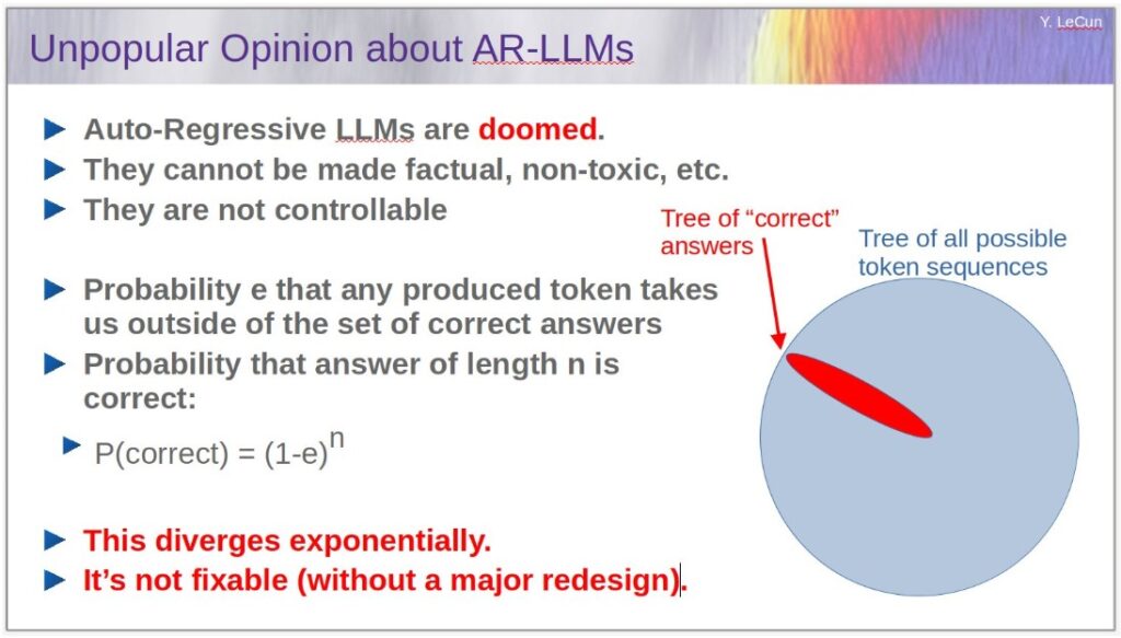 The more AI rambles, the more it lies. The “correctness” function diverges exponentially, right? LeCun seems to suggest, catastrophe is inevitable. Worse, the defect is not fixable (without major redesign, chart says).